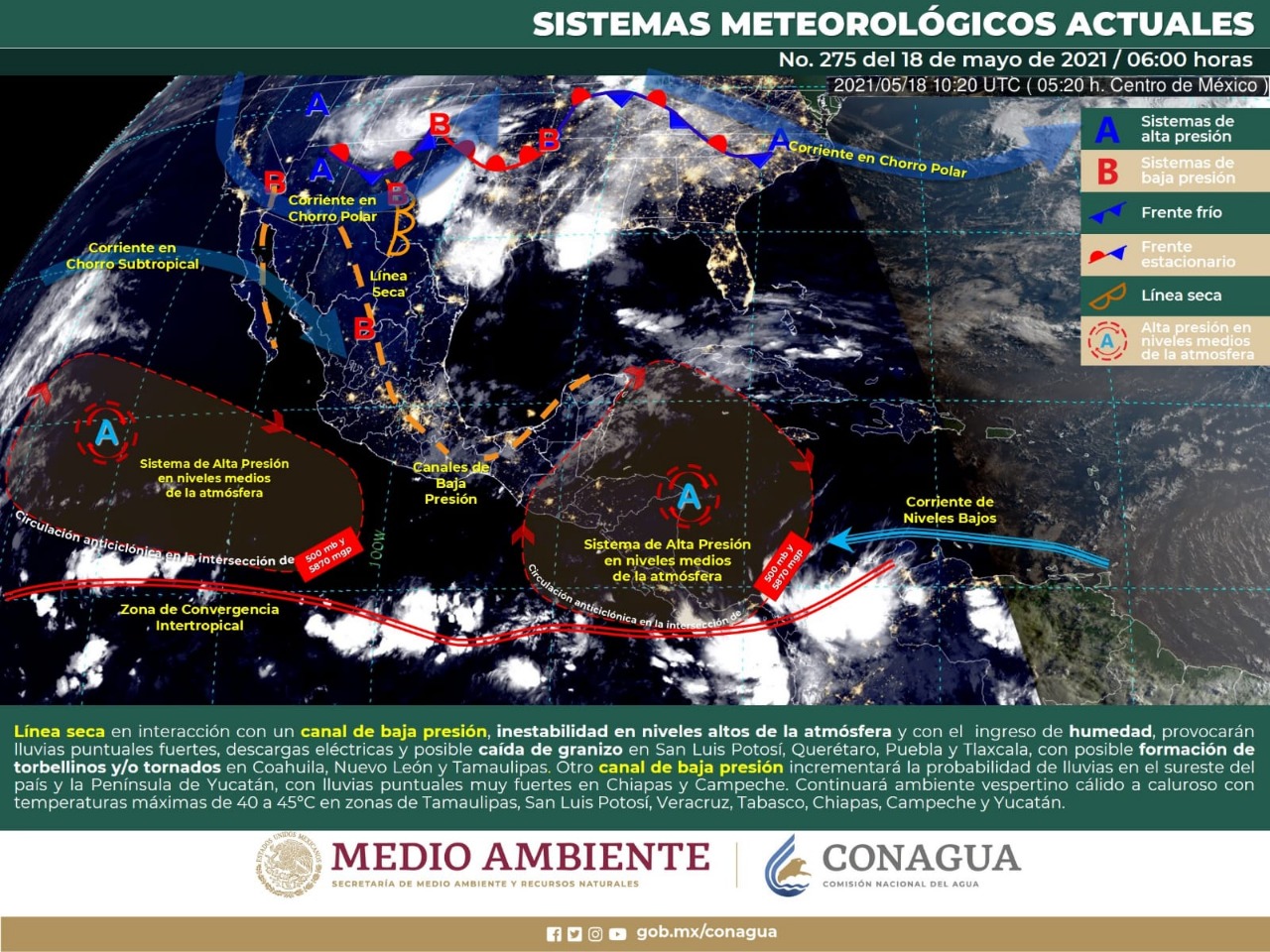 El Servicio Meteorológico Nacional (SMN) pronostica que una línea seca interaccione con un canal de baja presión sobre el noreste, oriente y centro del territorio, junto con inestabilidad en niveles altos de la atmósfera; condiciones que aunadas al ingreso de humedad de ambos océanos provocarán lluvias puntuales fuertes, descargas eléctricas, vientos fuertes, posible caída de granizo, con posible formación de torbellinos y/o tornados en Coahuila, Nuevo León y Tamaulipas.