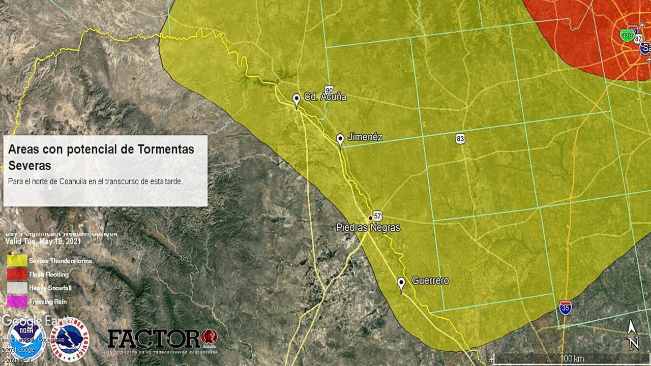 La Subsecretaría de Protección Civil del Estado (PC) informó que para el transcurso de la tarde y noche de este martes se tiene un área de vigilancia por potencial de tormentas severas sobre la frontera norte de Coahuila, misma que se encuentra con probabilidad de lluvias y vientos fuertes, caída de granizo y potencial de desarrollo de tornados.