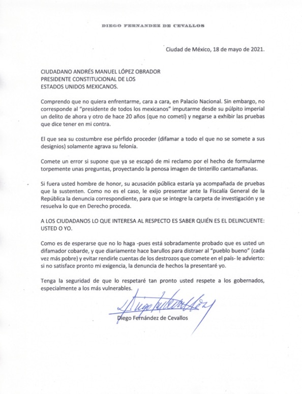 Enmarcado en el pleito que desde hace tiempo sostienen el panista Diego Fernández de Cevallos, y el presidente Andrés López, el primero mandó este martes una nueva carta al mandatario, en el cual lo llama “difamador cobarde” y le asegura que lo va a respetar, tan pronto como él respete a los ciudadanos. El texto de la carta es el siguiente: