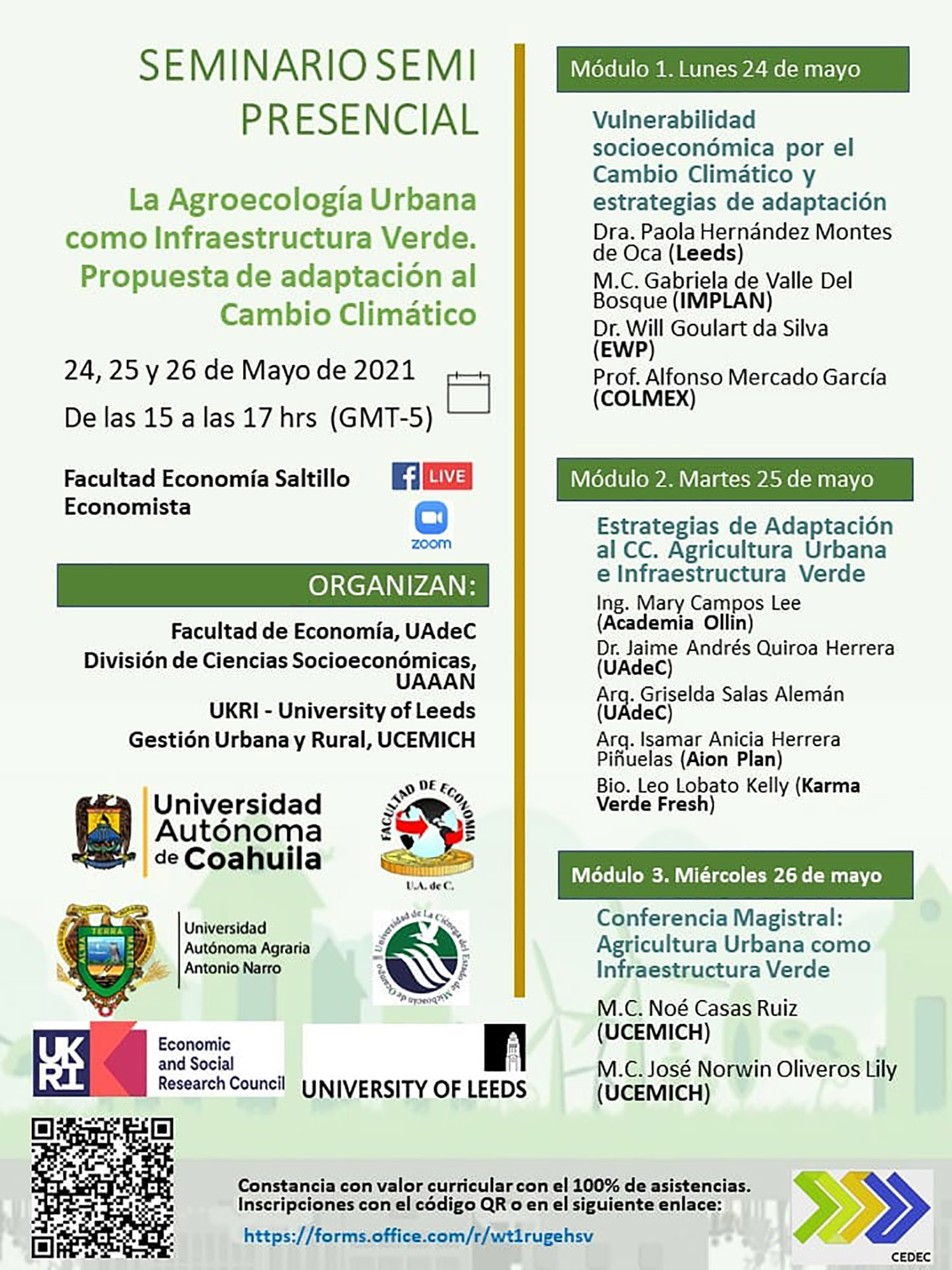 La Facultad de Economía de la Universidad Autónoma de Coahuila en conjunto con la División de Ciencias Económicas de la Universidad Autónoma Agraria Antonio Narro, University of Leeds y la Licenciatura en Gestión Urbana y Rural de la Universidad de La Ciénega del Estado de Michoacán de Ocampo, invitan al seminario semipresencial “La Agroecología Urbana como Infraestructura Verde, Propuesta de Adaptación al Cambio Climático”.