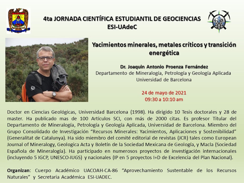 Con la ponencia “Yacimientos minerales, metales críticos y transición energética”, impartida por el Dr. Joaquín Antonio Proenza Fernández, Profesor del departamento de Mineralogía, Petrología y Geología Aplicada de la Universidad de Barcelona, habló sobre la demanda de los metales y su exploración en la litosfera en zonas desconocidas.