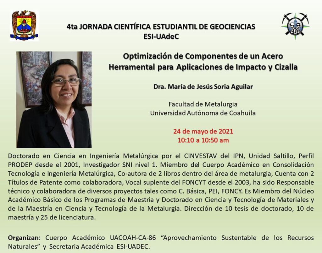 Por su parte, la doctora María de Jesús Soria Aguilar, expuso el tema “Optimización de Componentes de un Acero Herramental para Aplicaciones de Impacto y Cizalla, en el área metal mecánica”, ella tiene doctorado en ciencia en ingeniería Metalúrgica por el CINVESTAV del IPN, Unidad Saltillo, perfil PRODEP desde 2001 es docente de la Facultad de Metalurgia de la UAdeC, investigadora del SNIU Nivel 1, cuanta con dos títulos de patente como colaboradora, vocal suplente del FONCYT.