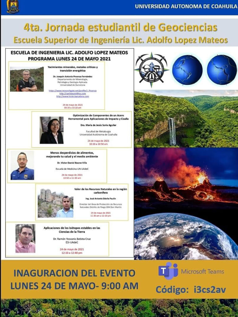 Nueva Rosita, Coahuila.- A partir de este lunes y hasta el jueves 27 de mayo, se lleva a cabo la Cuarta Jornada Científico-Estudiantil de Geociencias que organiza la Escuela Superior de Ingeniería “Adolfo López Mateos” de la Universidad Autónoma de Coahuila, y que se trasmite a través de Microsoft Teams para su comunidad universitaria de alumnos y maestros, además para el público en general.