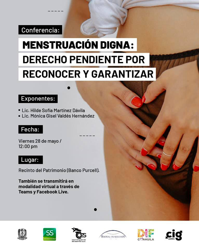 Otras acciones de ese mismo día en el Recinto del Patrimonio Cultural Universitario en Hidalgo Norte #211 en el Centro Histórico a las 12:00 horas se impartirá la conferencia “Menstruación digna: derecho pendiente por reconocer y garantizar” a cargo de la Lic. Hilde Sofía Martínez Dávila y la Lic. Mónica Gisel Valdés Hernández.