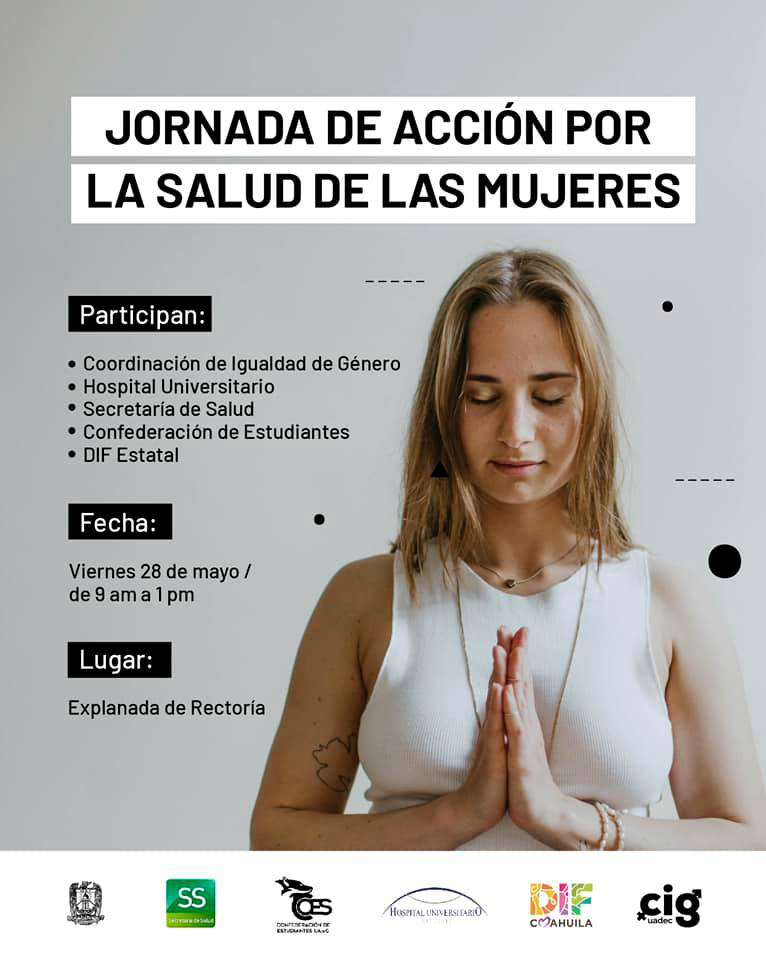 La Coordinación de Igualdad de Género de la Universidad Autónoma de Coahuila, invita este viernes 28 de mayo de 2021 a la “Jornada de Acción por la Salud de las Mujeres”, que se realizará en la Explanada de Rectoría de 9:00 am a 1:00 pm.