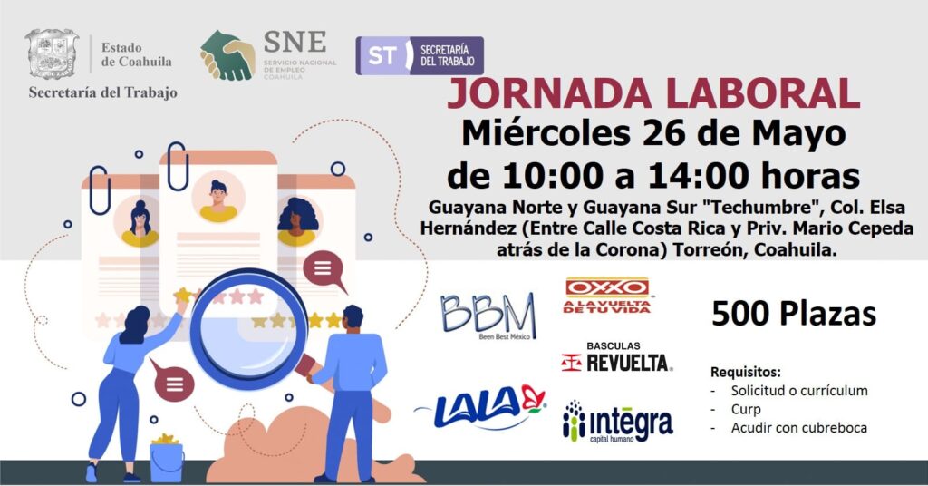 Torreón, Coahuila.- Será en la Colonia Elsa Hernández la siguiente Jornada Laboral en Tu Colonia que organiza el Gobierno de Coahuila, a través de la Secretaría del Trabajo (ST) y el Servicio Nacional del Empleo (SNE) Laguna.