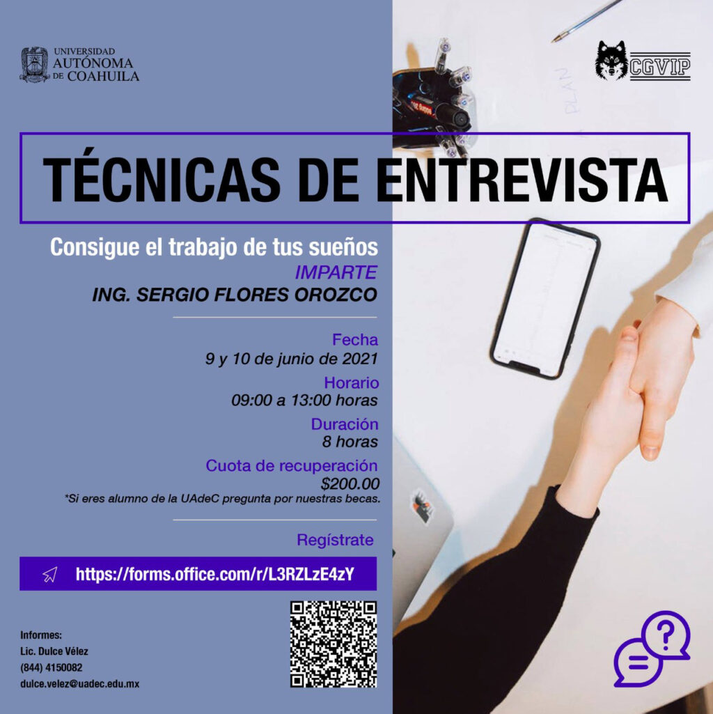 Con el fin de fortalecer las habilidades para una exitosa entrevista de trabajo, la Universidad Autónoma de Coahuila a través de la Coordinación General de Vinculación e Innovación Productiva, invita la comunidad universitaria al taller “Técnicas de entrevista”, que se llevará a cabo por medio de Microsoft Teams, los días 9 y 10 de junio en horario de 9:00 a 13:00 horas.