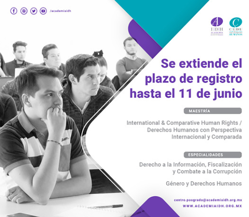 La Academia Interamericana de Derechos Humanos de la Universidad Autónoma de Coahuila, extiende hasta el 11 de junio de 2021 el registro para cursar la Maestría en Derechos Humanos con Perspectiva Internacional Comparada y la Especialidad en Derecho a la Información, Fiscalización y Combate a la Corrupción.