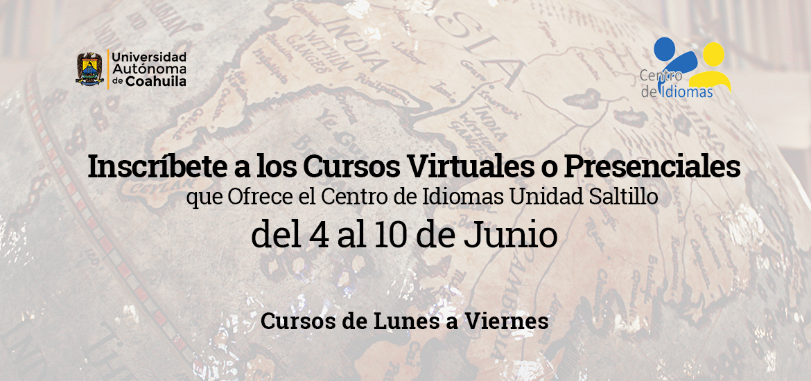 El Centro de Idiomas Unidad Saltillo de la Universidad Autónoma de Coahuila, abrirá del 4 al 10 de junio de 2021 las inscripciones para los cursos virtuales o presenciales entre semana de inglés, alemán, francés e italiano para el periodo del 14 de junio al 6 de agosto de 2021.