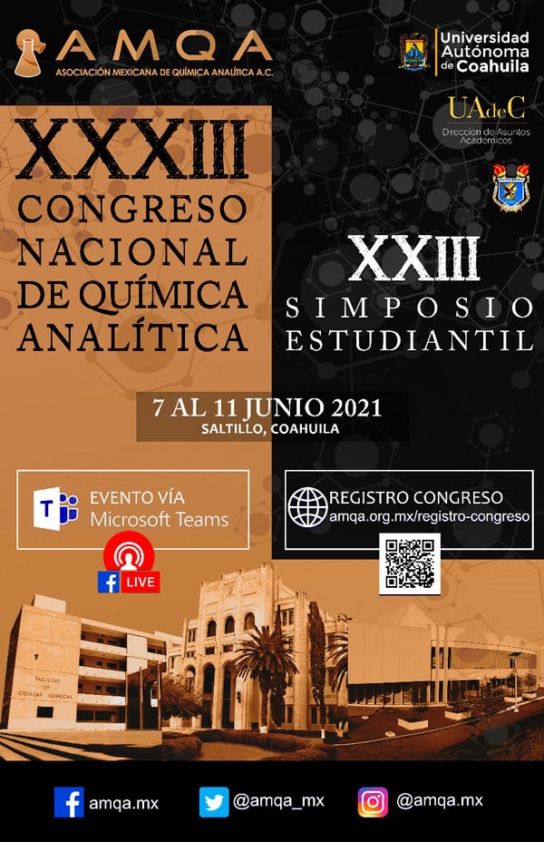 La Facultad de Ciencias Químicas de la Universidad Autónoma de Coahuila y la Asociación Mexicana de Química Analítica, A.C (AMQA) convocan a estudiantes, docentes, investigadores y profesionistas al XXXIII Congreso Nacional de Química Analítica, que se llevará a cabo del 9 al 11 de junio a través de la plataforma Microsoft Teams.