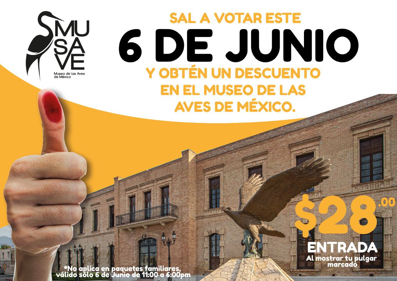 Este próximo domingo 6 de junio, para quienes hayan votado y muestren su pulgar entintado, el Museo de las Aves de México (Musave) ofrecerá su entrada a $28.00 pesos por adulto, en lugar de $47.00, durante su horario de 11:00 de la mañana a 6:00 de la tarde.