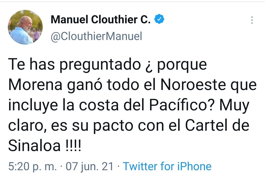 Tras conocerse los resultados de las elecciones del pasado domingo 6 de junio, Manuel Clouthier expresó que MORENA está vinculado con el Cartel de Sinaloa, debido que ganó las candidaturas de la costa noroeste del país, incluyendo las gubernaturas de Baja California, Sonora y Sinaloa