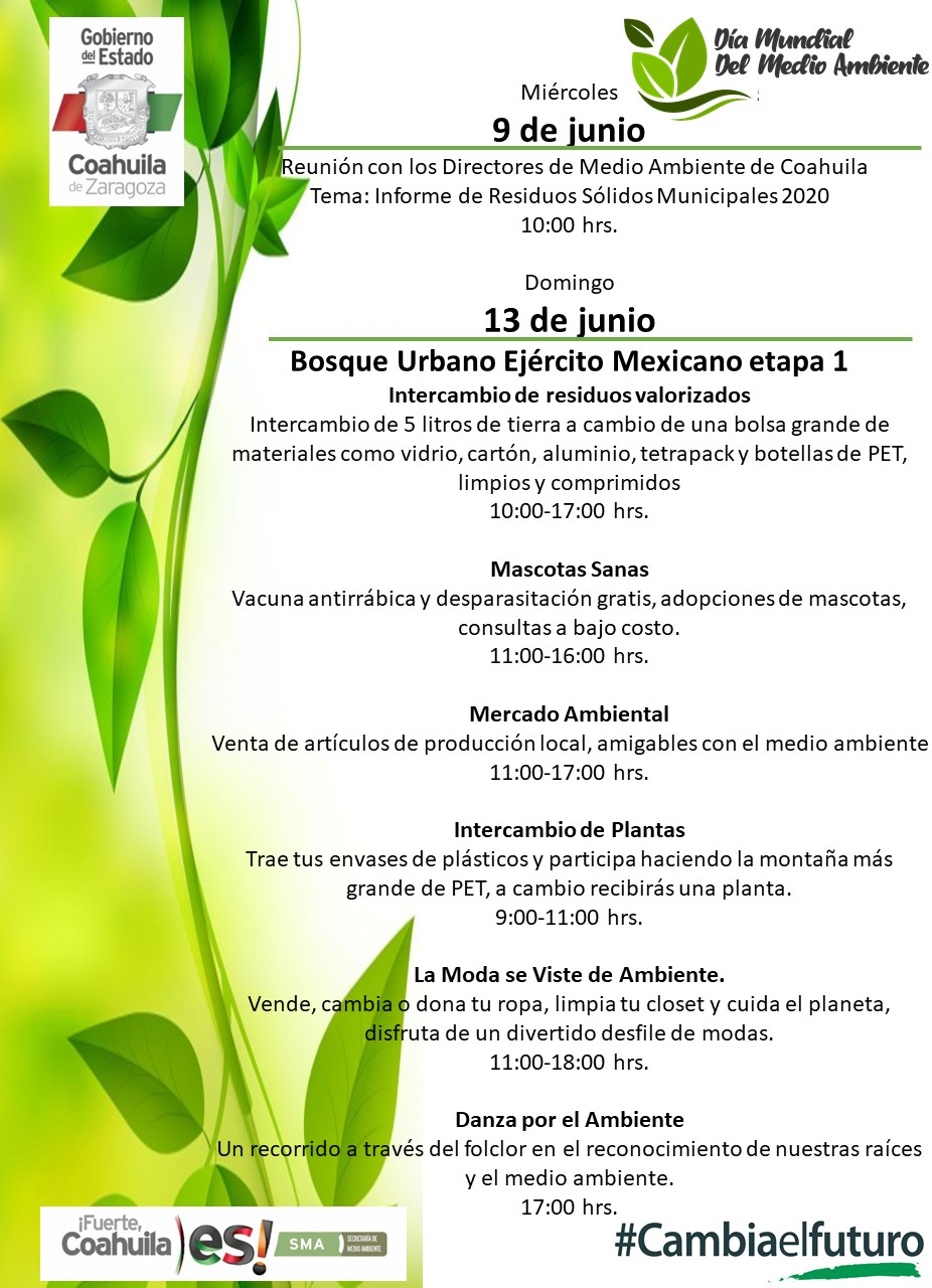 El próximo domingo, el Gobierno del Estado conmemorará el Día Mundial del Medio Ambiente con una serie de actividades que tendrán lugar en el Gran Bosque Urbano-Ejército Mexicano, en esta ciudad.