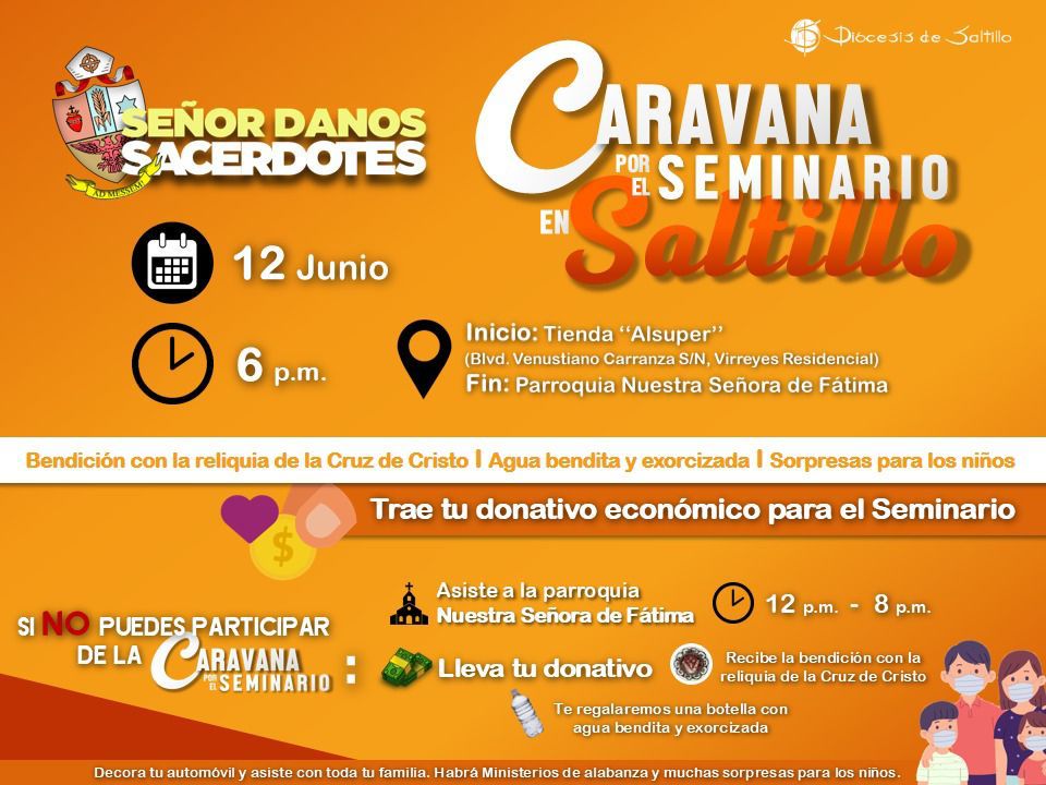 Para obtener donativos económicos destinados a su funcionamiento y como parte del cierre de su campaña anual para incentivar la vocación sacerdotal, el Seminario Diocesano de Saltillo efectuará, este próximo sábado a partir de las 6:00 de la tarde, una caravana de vehículos que partirá de la Tienda Alsuper instalada en Bulevar Venustiano Carranza, sin número, colonia Virreyes Residencial, para concluir en la parroquia de Nuestra Señora de Fátima.