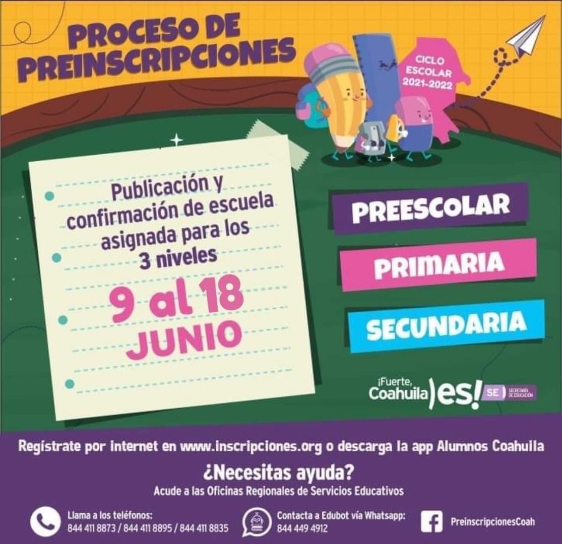 Del miércoles 9 al viernes 18 de junio estará instalado en la Dirección de Desarrollo Social de Ramos Arizpe, en la Presidencia Municipal, un módulo de preinscripciones de la Secretaría de Educación (SEDU) del estado para la atención, publicación y confirmación de la escuela asignada para los alumnos que cursarán o bien darán continuidad a su educación básica, es decir, en los niveles de preescolar, primaria y secundaria para el ciclo escolar 2021-2022.