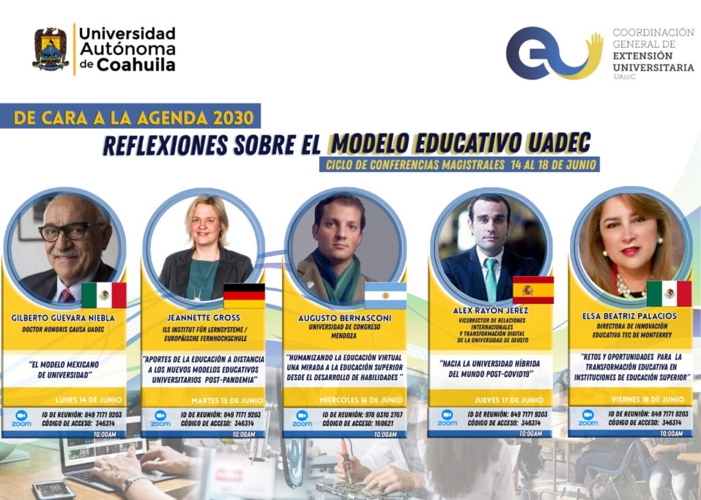 Con el objetivo de propiciar el intercambio de experiencias con otras universidades de México y el mundo, la Universidad Autónoma de Coahuila a través de la Coordinación General de Extensión Universitaria, invita al ciclo de conferencias magistrales “De cara a la agenda 2030, reflexiones sobre el Modelo Educativo de la UAdeC” en la semana del 14 al 18 de junio.