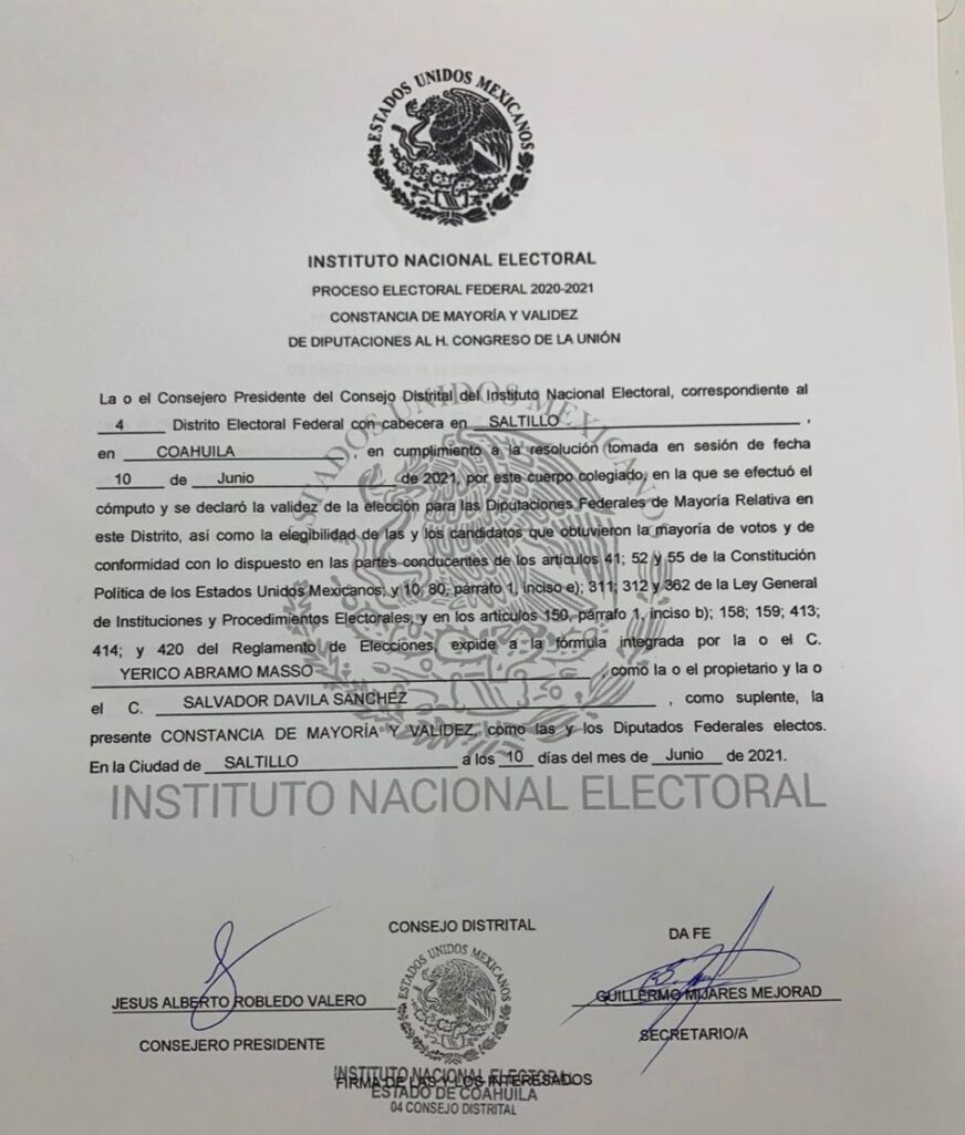 Después de que se llevará a cabo un proceso democrático y de transparencia electoral en Coahuila, Jericó Abramo Masso recibió la constancia de mayoría que lo acredita como Diputado Federal electo por el Cuarto Distrito.