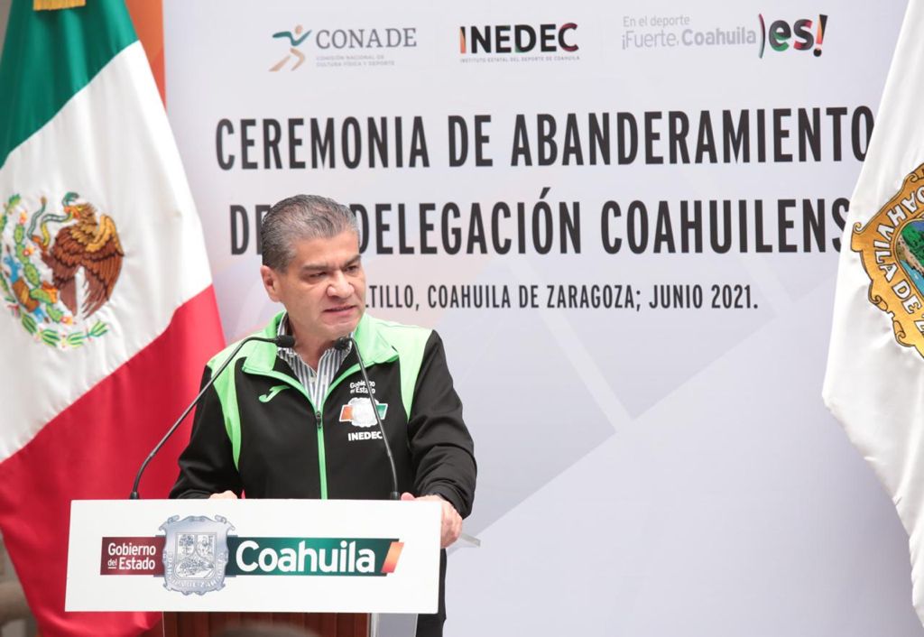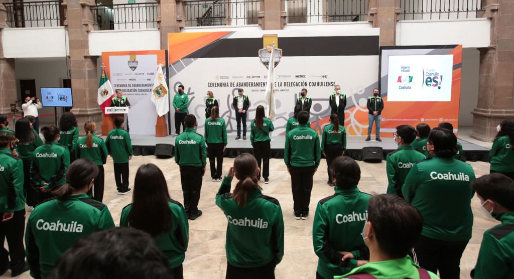 En su mensaje en Palacio de Gobierno ante atletas y entrenadores de diversas disciplinas, el Mandatario estatal les expresó la mejor de las suertes, que porten con honor sus colores y pongan en lo más alto el nombre de Coahuila, mostrando siempre juego limpio y respeto a los competidores.