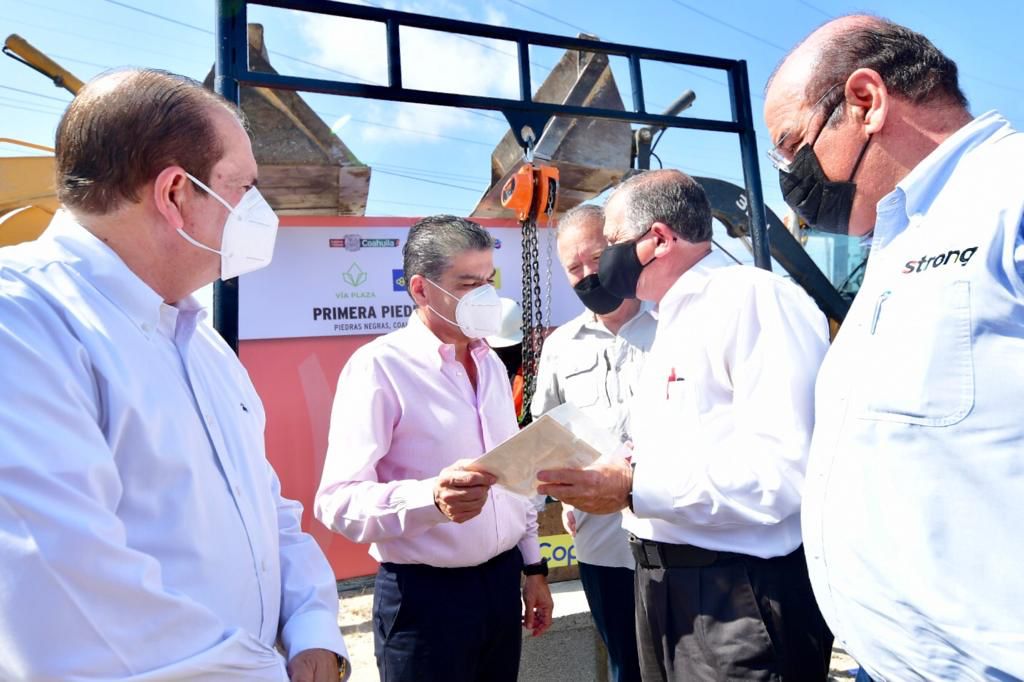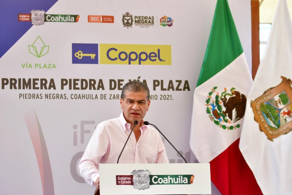 Piedras Negras, Coahuila.- El Gobernador del Estado, Miguel Ángel Riquelme Solís, acudió a la ceremonia de colocación de la primera piedra de Plaza Vía Coppel, donde se invertirán 162 millones de pesos, con generación total de 626 empleos, 400 en la etapa de construcción y el resto en su operación.