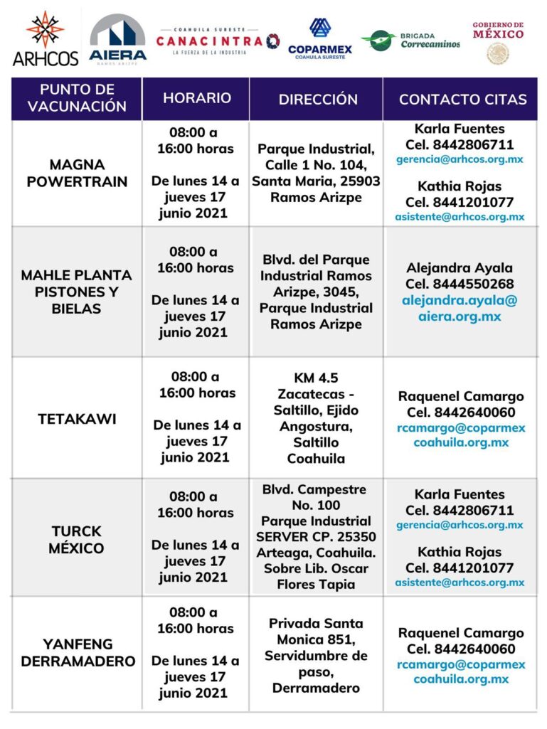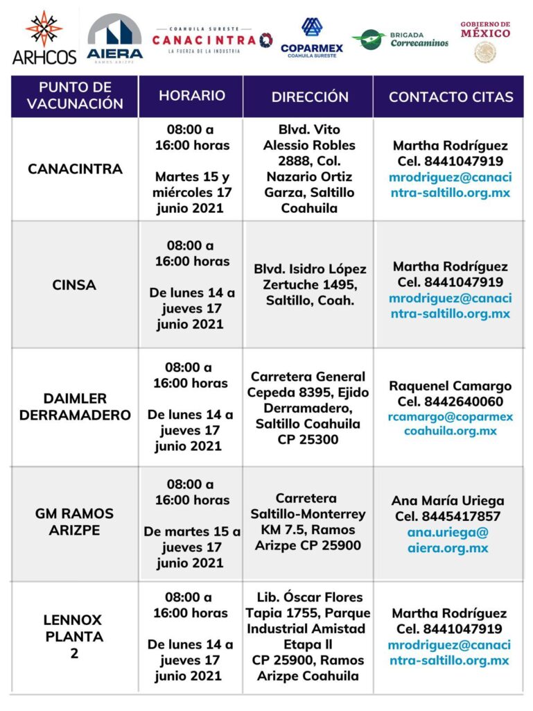 Los puntos de vacunación se ubicarán en CANACINTRA Sureste, del bulevar Vito Alessio Robles, así como en la planta CINSA del bulevar Isidro López, en Daimler Derramadero, GM Ramos Arizpe y en Lennox Planta 2 del Libramiento Oscar Flores Tapia en el Parque Industrial Amistad Etapa II.