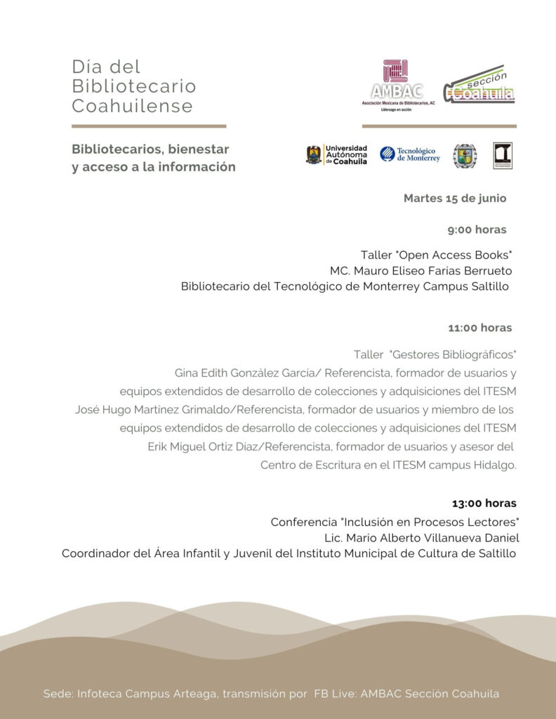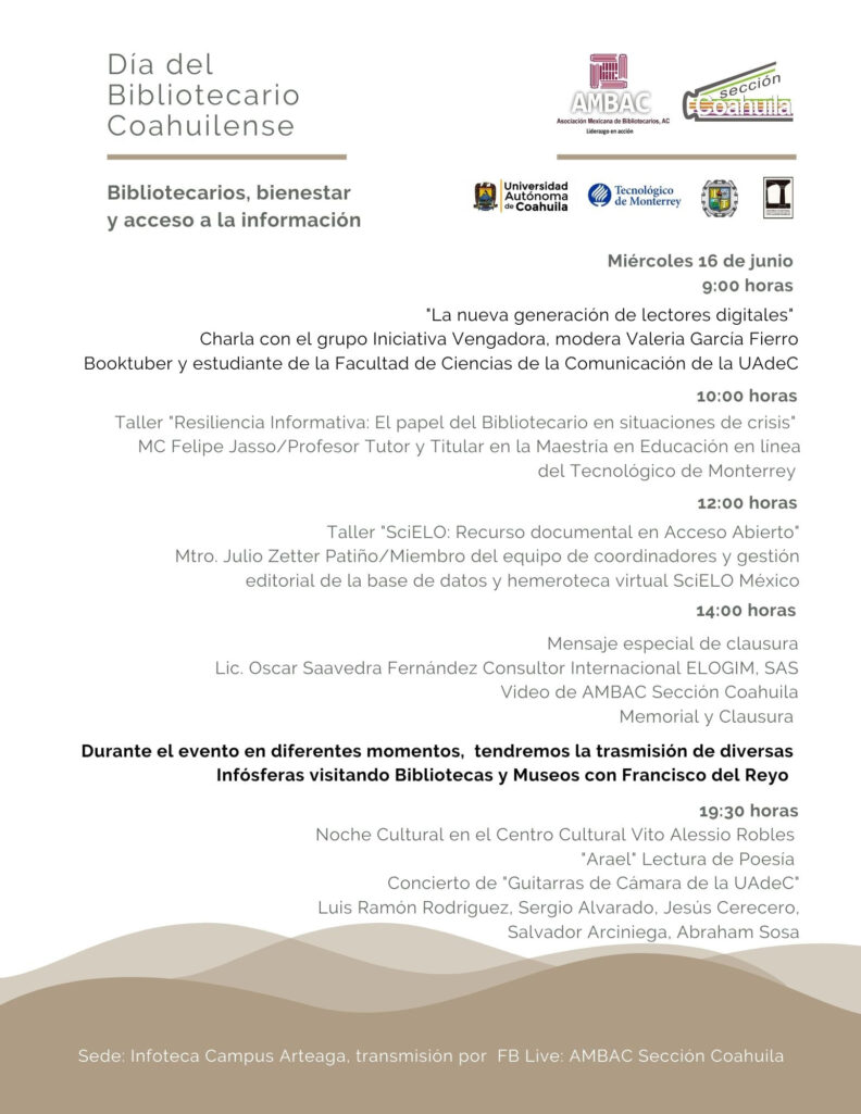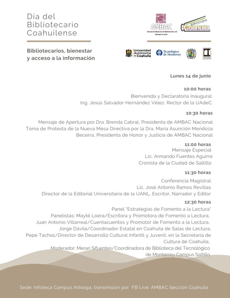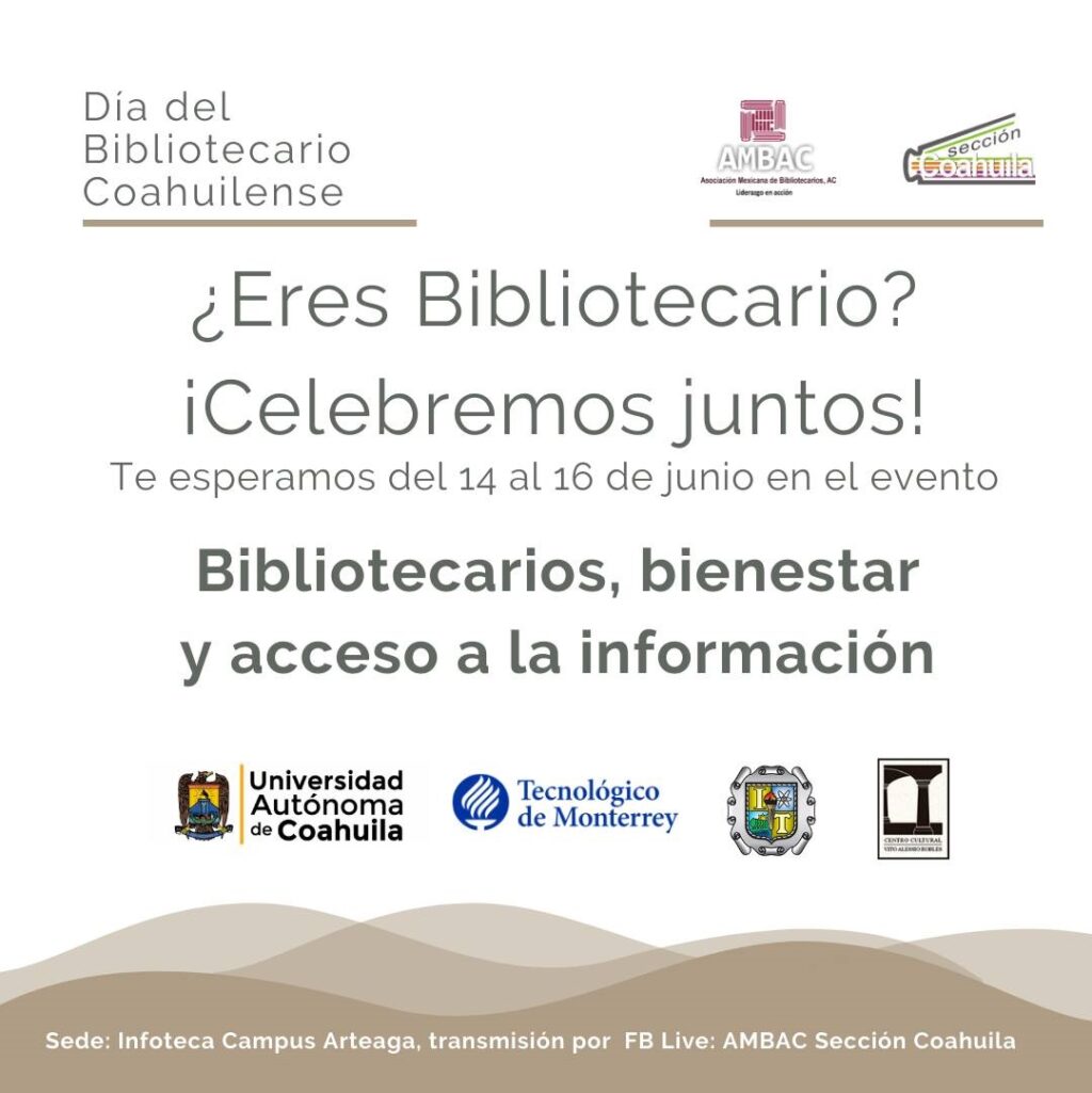 En el marco del Día del Bibliotecario Coahuilense que se celebra el 13 de junio, la Universidad Autónoma de Coahuila en conjunto con la Asociación Mexicana de Bibliotecarios, A. C. (AMBAC) Sección Coahuila, invitan a las actividades de conmemoración “Bibliotecarios, bienestar y acceso a la información” del 14 al 16 de junio en la Infoteca Campus Arteaga.