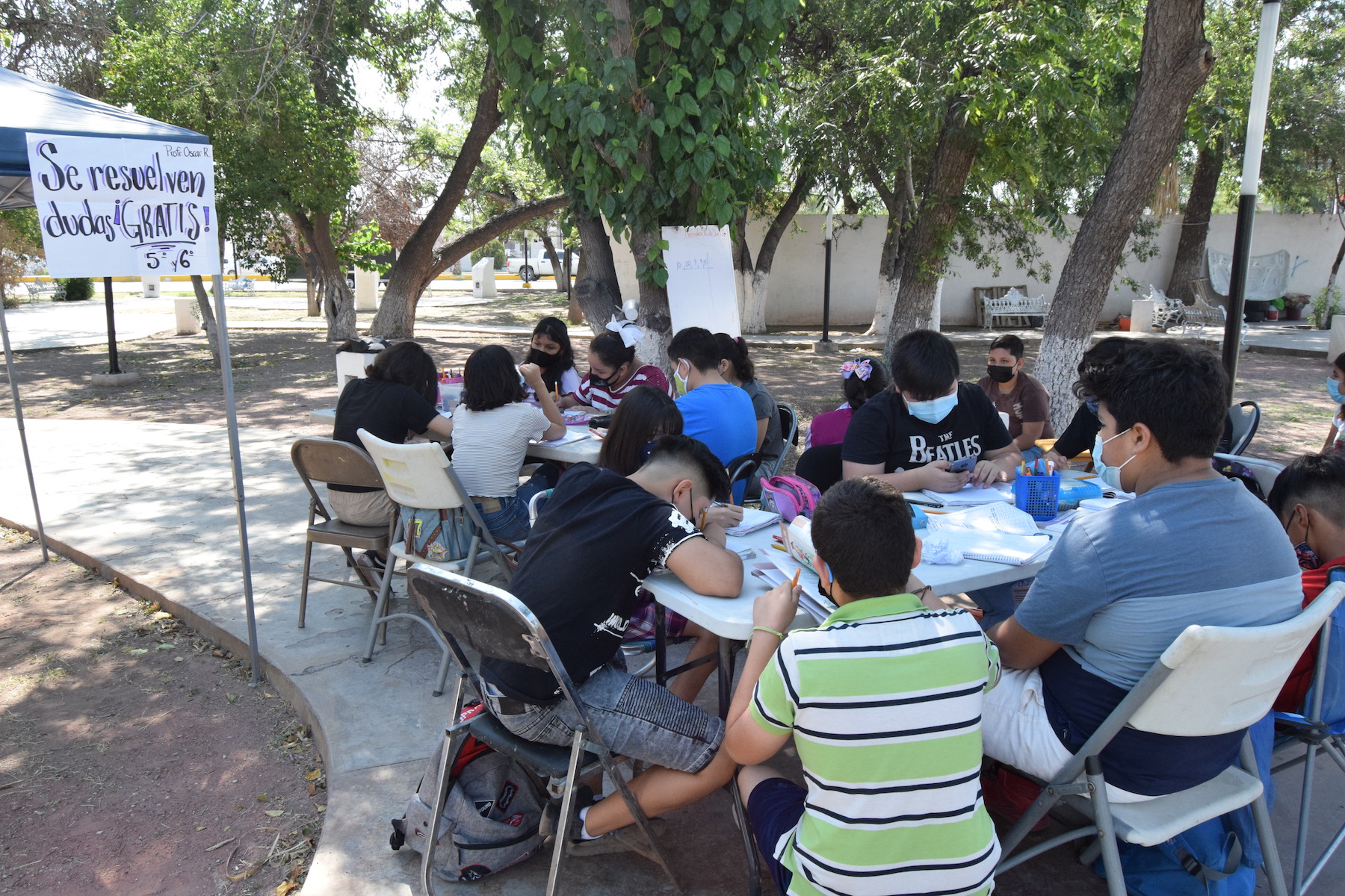 En una plaza o bajo la sombra de un árbol, el maestro coloca su pizarrón, un anuncio de “Se resuelven dudas, gratis, quinto y sexto año”, y una mesa para los alumnos quienes comienzan a llegar con su silla para escuchar al maestro y aprender.