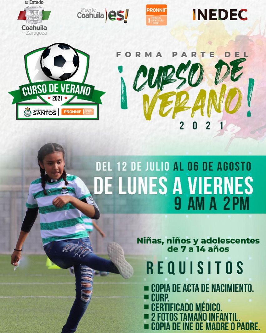 El Club de Futbol Santos-Laguna y la Procuraduría para las Niñas, Niños y la Familia del Estado (PRONNIF) dieron a conocer las sedes donde tendrán lugar las inscripciones para el Curso de Verano 2021 en los municipios de Torreón, Saltillo, Monclova, Nava y Múzquiz: