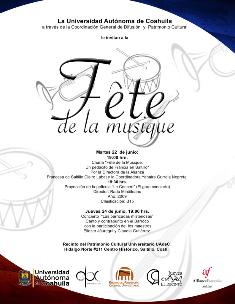 La Coordinación General de Difusión y Patrimonio Cultural de la Universidad Autónoma de Coahuila en conjunto con la Alianza Francesa de Saltillo invitan a la “Fête de la Musique” (fiesta de la música), la cual se llevará a cabo el 22 y 24 de junio de 2021 en el Recinto del Patrimonio Cultural Universitario, que se ubica en la calle Hidalgo #211 en el Centro Histórico de la Ciudad.