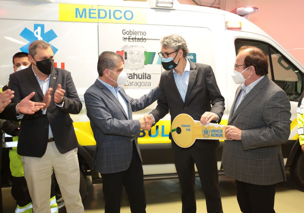 Para reforzar la atención médica especializada de urgencias en el Estado de Coahuila, el Alto Comisionado de las Naciones Unidas para los Refugiados (ACNUR) hizo entrega al gobernador Miguel Ángel Riquelme Solís de una ambulancia altamente especializada y equipada para su operatividad inmediata en la entidad.