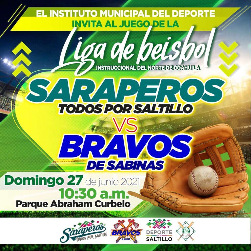 Con la firme intención de obtener la primera posición dentro de la Temporada 2021 de la Liga de Beisbol Instruccional del Norte de Coahuila, el equipo «Saraperos Todos por Saltillo» se enfrentará a «Bravos de Sabinas» el próximo domingo a las 10:30 de la mañana, en el Parque Abraham Curbelo de la capital coahuilense.