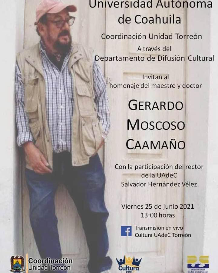 Torreón Coahuila.- La Coordinación de Unidad Torreón de la Universidad Autónoma de Coahuila a través del Departamento de Difusión Cultural, rendirá homenaje póstumo al maestro y doctor Gerardo Moscoso Caamaño, este viernes 25 de junio a las 13:00 horas, por medio del Facebook Live: Cultura UA de C Torreón.
