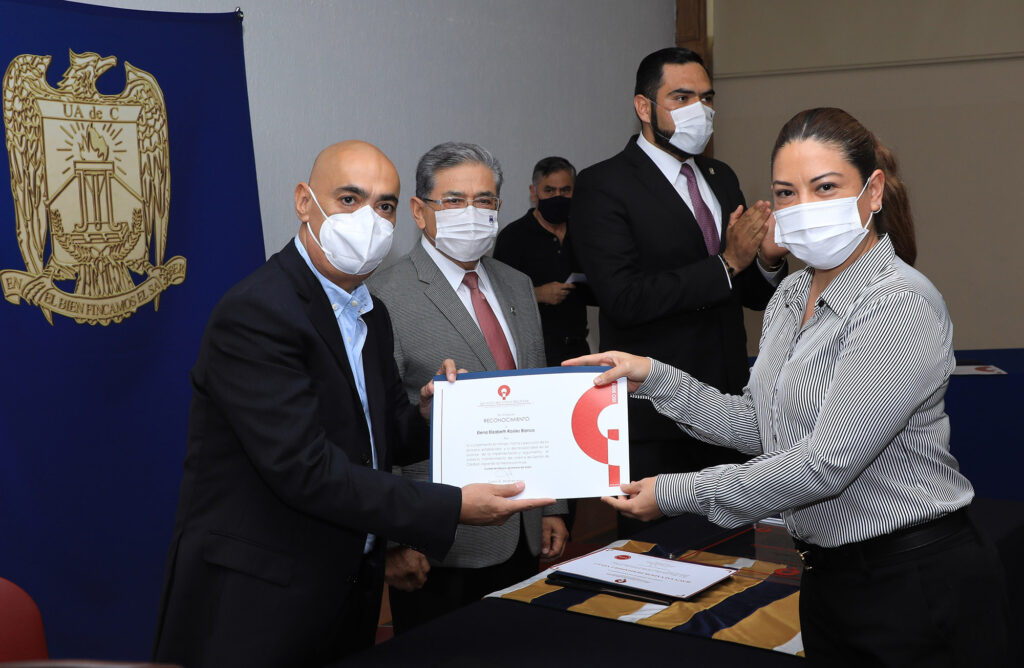 Carlos Miranda Arvizu, presidente del organismo entregó la certificación de la Norma “ISO 9001:2015 Sistema de gestión de la calidad” por décimo séptimo año consecutivo a la Universidad Autónoma de Coahuila y un reconocimiento a la gestión administrativa y compromiso con la calidad al Rector Salvador Hernández, al Oficial Mayor y ex director de Planeación, Luis Gutiérrez Flores, al jefe del Departamento de Gestión de Calidad, Eduardo Bonilla Pinell y a las colaboradoras Elena Elizabeth Rosiles Blanco, Areli Marisol Torres Obregón y Claudia Lucia Pachicano Rodríguez.