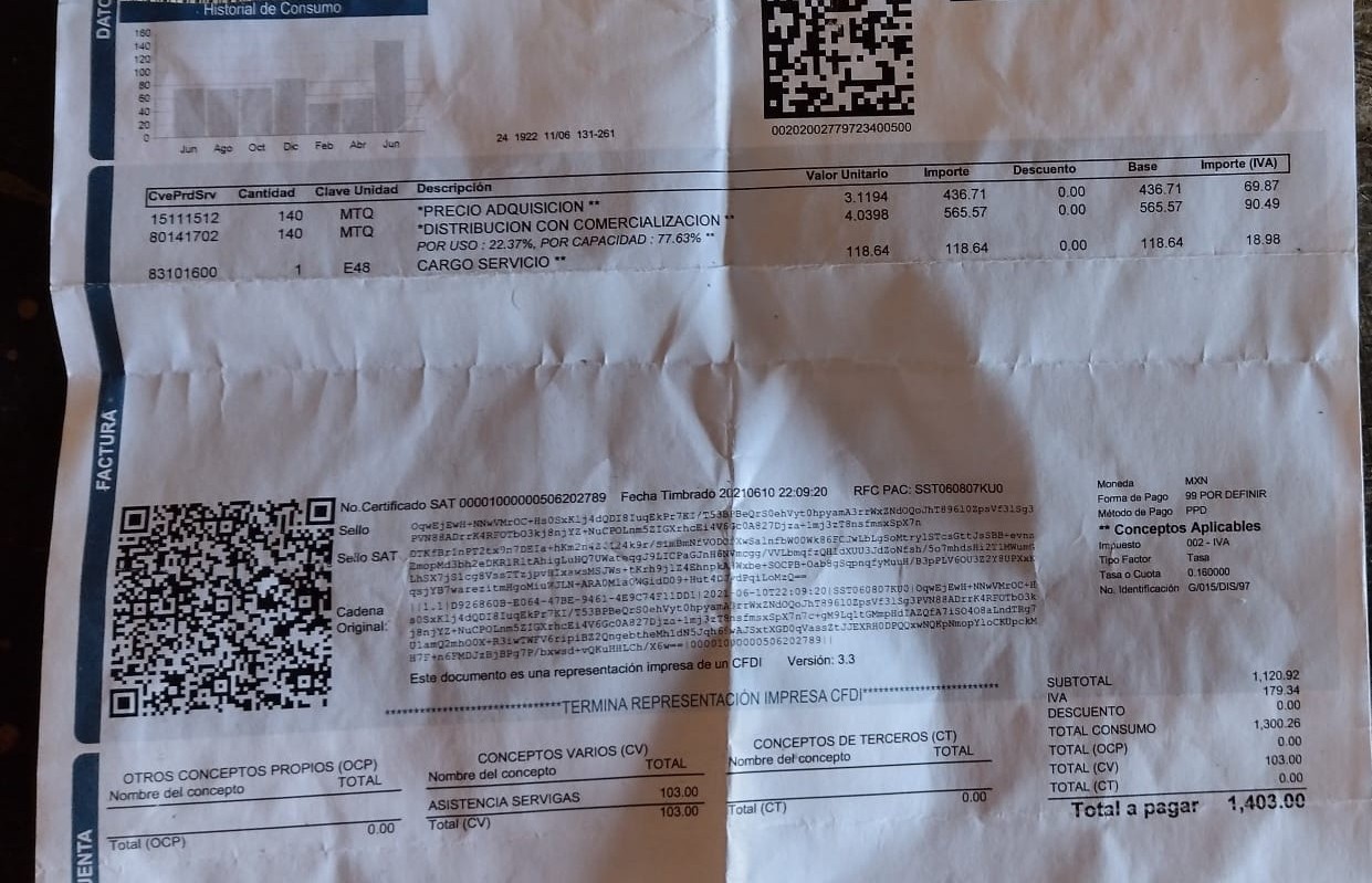 Señaló que en este bimestre, el cobro fue de mil 403 pesos, cuando normalmente pagaba entre 600 y 700 pesos.
