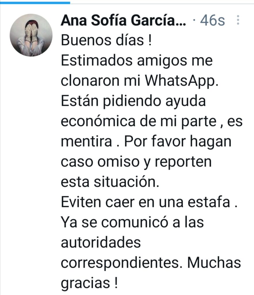 «Buenos días. Estimados amigos me clonaron mi WhatsApp. Están pidiendo ayuda económica de mi parte, es mentira. Por favor hagan caso omiso y reporten esta situación. Eviten caer en una estafa. Ya se comunicó a las autoridades correspondientes», se lee en el mensaje difundido por García Camil. (OMAR SOTO / EL HERALDO)