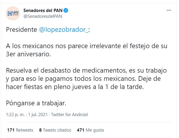 “Presidente @lopezobrador_: A los mexicanos no nos interesa el festejo de su tercer aniversario. Resuelva el desabasto de medicamentos que ese su trabajo y para eso le pagamos todos los mexicanos. Deje de hacer fiestas en pleno jueves a la 1 de la tarde. Pónganse a trabajar”, publicaron en su cuenta oficial de Twitter. (EL HERALDO)