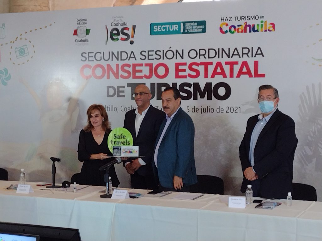 Este lunes, dentro de la Segunda Sesión Ordinaria del Consejo Estatal de Turismo y Desarrollo de Pueblos Mágicos que se celebró en el Museo de las Aves de México, en Saltillo, la funcionaria estatal recibió el sello «Safe Travels», expedido por el Consejo Mundial de Viajes y Turismo, el cual avala la aplicación de medidas de higiene y sanitización de establecimientos como restaurantes y hoteles de Coahuila contra la Covid-19.