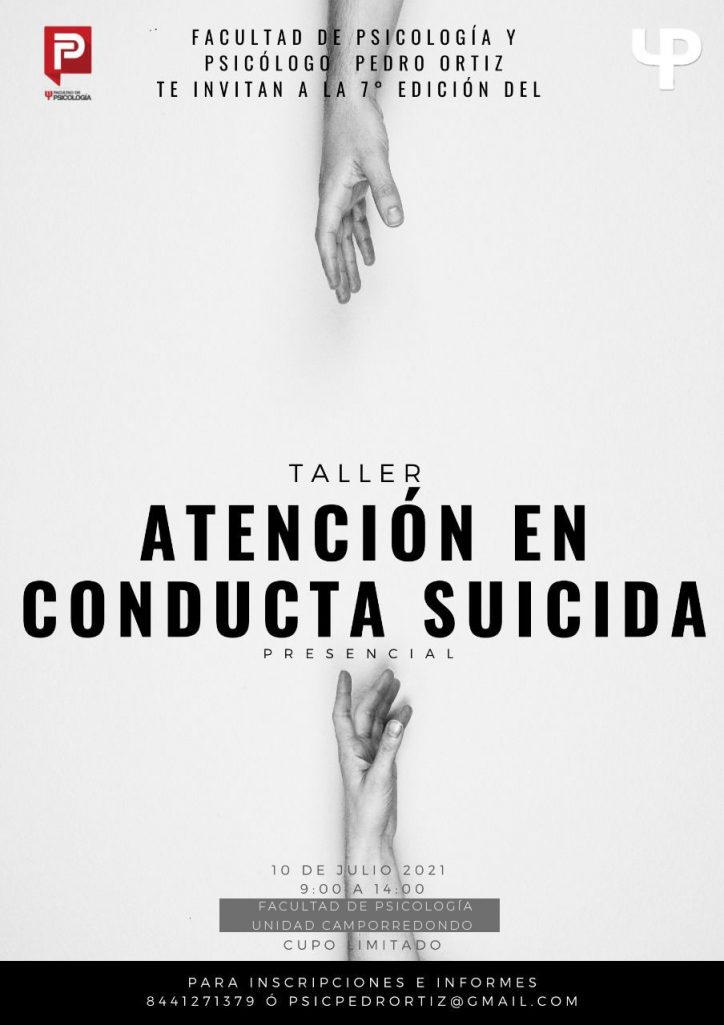 La Facultad de Psicología de la Universidad Autónoma de Coahuila, invita a la séptima edición del taller de Atención en Conducta Suicida, que se desarrollará de manera presencial el sábado 10 de julio de 9:00 a 14:00 horas en las instalaciones del plantel, ubicadas en el Edificio C, planta baja de la Unidad Camporredondo en Saltillo.