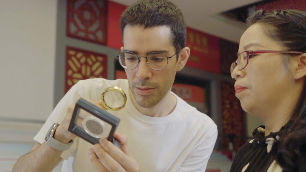 El profesor mexicano Diego Barroso (izquierda) observa con una lupa la moneda de plata con carácter «gong» en el Museo de Monedas Jinjiufu, ubicado en Nanchang, capital de la provincia de Jiangxi.