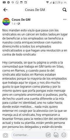 En una carta en la citada página de Facebook “Cosas de GM” se señaló que este tipo de dirigentes se benefician a costa de los empleados enriqueciéndose de las cuotas.