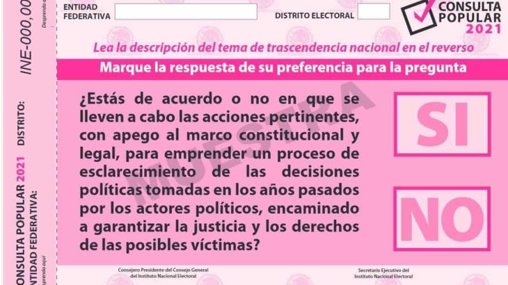 Las papeletas que se utilizarán durante la Consulta están impresas en tamaño media carta, en papel bond y en su parte frontal se puede leer la pregunta objeto de la Consulta, que fue avalada por la Suprema Corte de Justicia de la Nación, así como las dos opciones de respuesta que estarán disponibles para que la ciudadanía manifieste su decisión: sí y no.