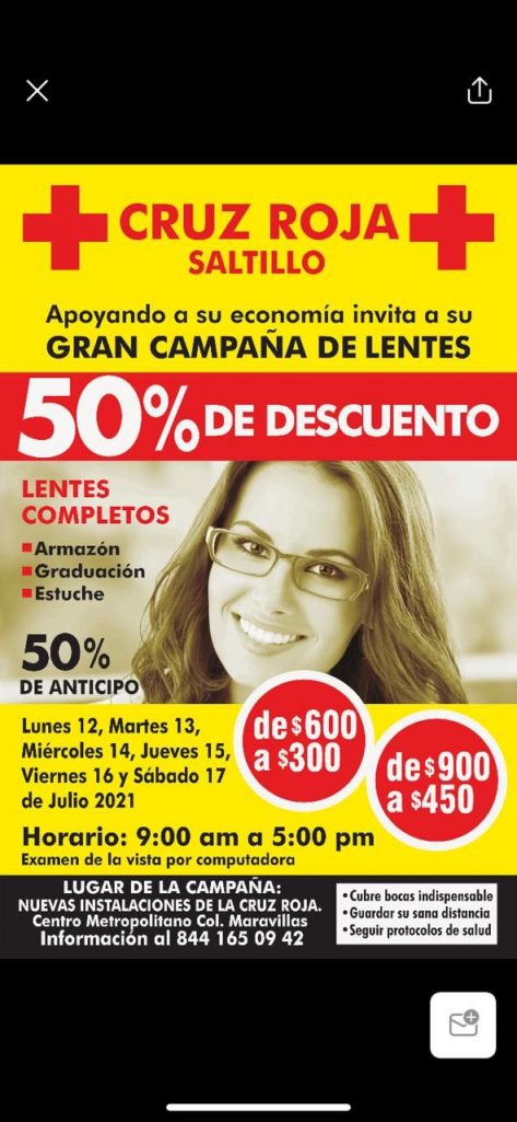 La delegación Saltillo de la Cruz Roja dio a conocer que luego de más de un año de suspensión debido a la pandemia del COVID-19, se volverá a llevar  a cabo la campaña de lentes a bajo costo que ofrece la humanitaria institución en beneficio de la economía de los saltillenses, los que podrán acceder a lentes completos con descuentos de hasta un 50 por ciento.