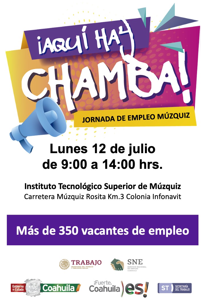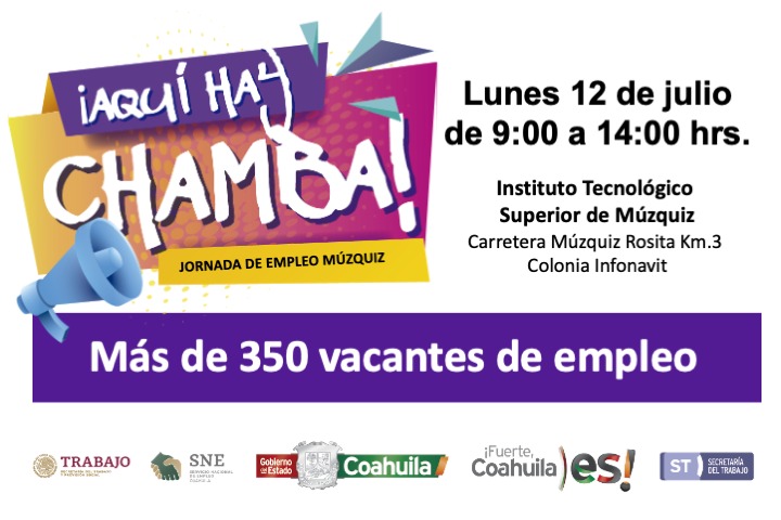 El evento se desarrollará en las instalaciones del Instituto Tecnológico Superior de Múzquiz, donde participarán 5 empresas de la Región Carbonífera reclutando personal de las 09:00 a las 14:00 horas de este lunes 12 de julio.
