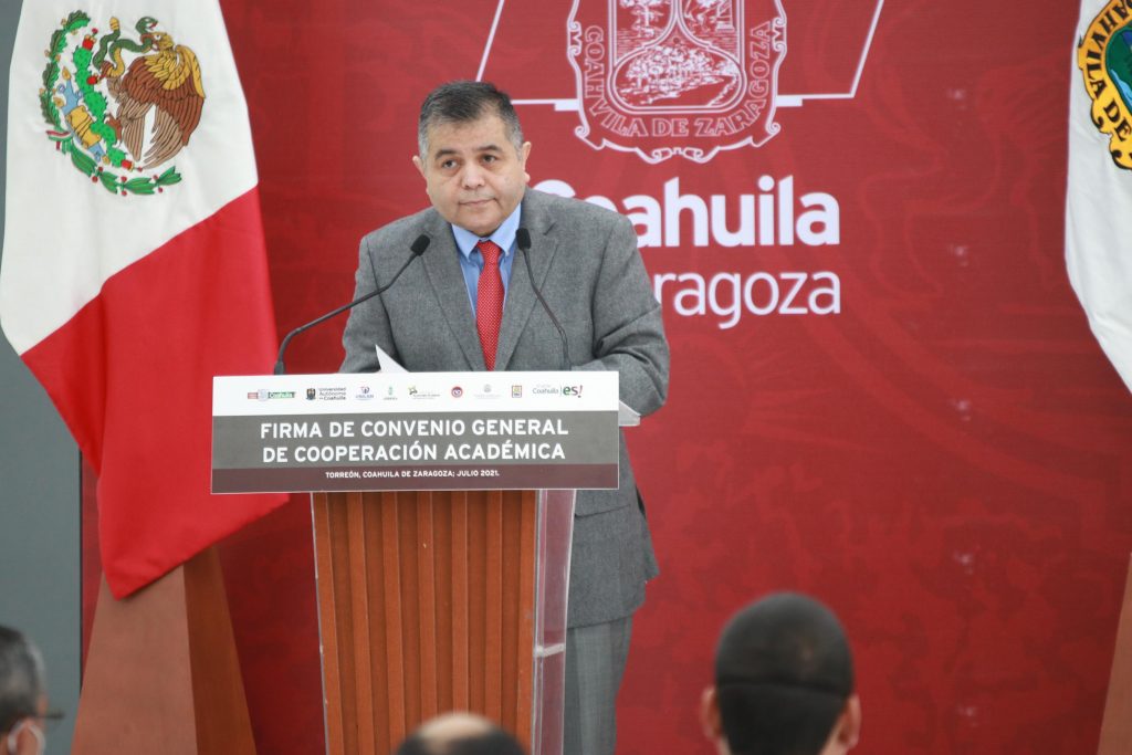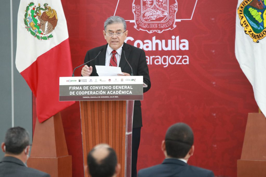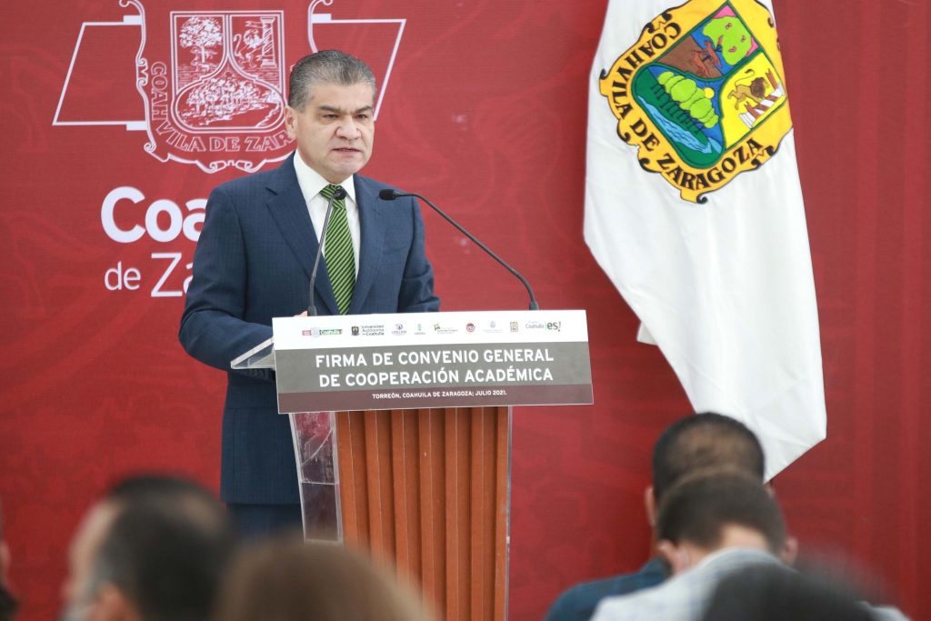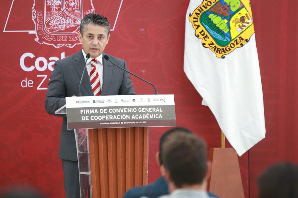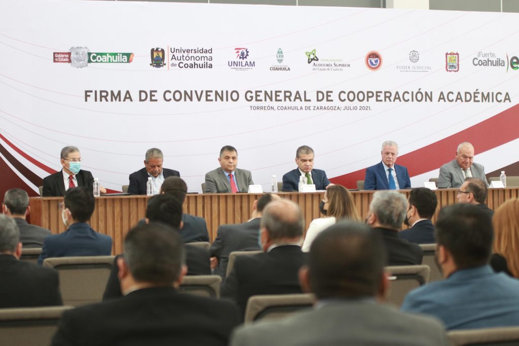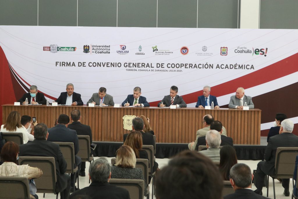 El convenio fue signado por el gobernador del estado de Coahuila, Miguel Ángel Riquelme Solís, el rector de la máxima casa de estudios, Salvador Hernández Vélez, el diputado y presidente de la Junta de Gobierno del Congreso del Estado, Eduardo Olmos Castro, el Magistrado Presidente del Tribunal Superior de Justicia del Estado, Miguel Mery Ayup y el secretario general de la Confederación de Trabajadores de México (CTM) delegación Coahuila, Tereso Medina Rodríguez.