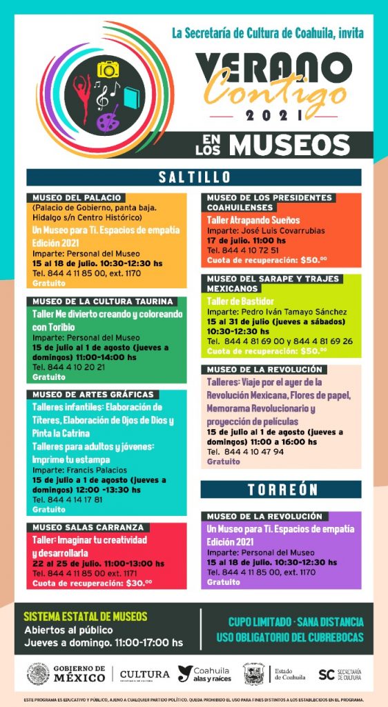 El Gobierno del Estado, a través de la Secretaría de Cultura, da a conocer la cartelera del Programa “Verano Contigo… en los Museos”, mismo que dará inicio el 15 de julio.