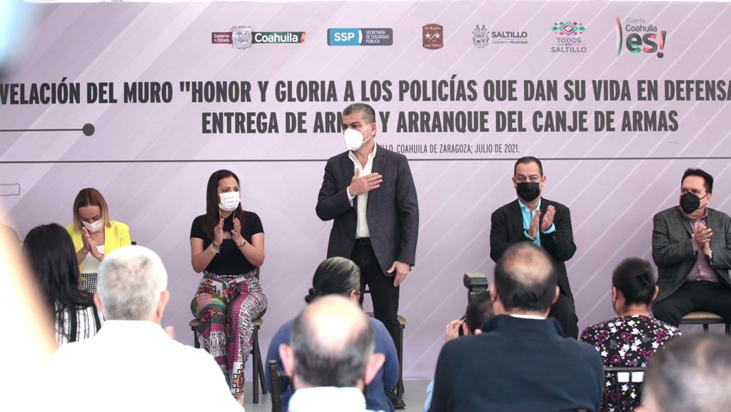 Previo al evento de entrega de armas y acompañado por Fernando de las Fuentes Hernández, Secretario de Gobierno; Gerardo Márquez Guevara, Fiscal General del Estado, y Sonia Villarreal Pérez, Secretaria de Seguridad Pública del Estado; así como autoridades militares, diputados locales y magistrados, el gobernador Miguel Riquelme develó el “Muro de Honor y Gloria”.