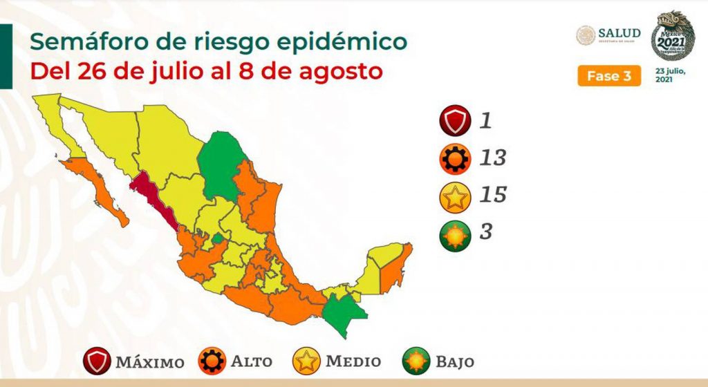 Reporte Índigo publicó que a partir del próximo lunes 26 de julio, México tendrá un estado en rojo, 13 en naranja, 15 en amarillo y sólo tres en verde.