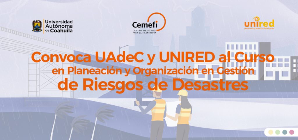 Con el objetivo de prevenir y gestionar riesgos de desastres en la comunidad y centros de trabajo, la Universidad Autónoma de Coahuila a través de la Coordinación General de Extensión Universitaria en colaboración con la Red Universitaria para la Prevención y Atención de Desastres (UNIRED), convocan al curso especializado en línea sobre Planeación y Organización en Gestión de Riesgos de Desastres, que inicia el 17 de agosto.