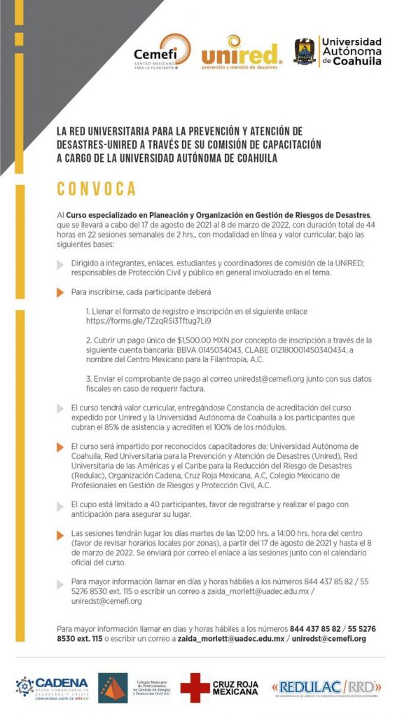 Asimismo, será impartido por reconocidos capacitadores de la UA de C, la UNIRED, la Red Universitaria de las Américas y el Caribe para la Reducción de Riesgos de Desastres (Redulac), Organización Cadena, Cruz Roja Mexicana A.C, Colegio Mexicano de Profesionales en Gestión de Riesgos y Protección Civil A.C.