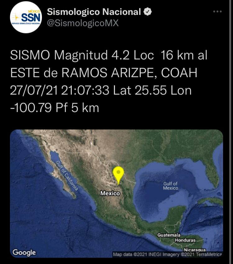De acuerdo con información del Servicio Sismológico Nacional, el movimiento telúrico tuvo su epicentro a 16 kilómetros al este de Ramos Arizpe, cerca de la comunidad de San José de los Nuncio, a una profundidad de 5 kilómetros.