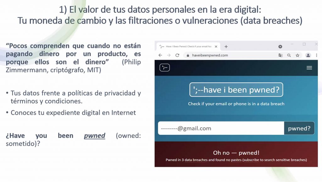 En su exposición, “Desafíos y responsabilidades en la protección de datos personales en la era digital”, mencionó que a nivel global casi la mayoría de datos personales digitales han sido violentados. Esto se debe, por lo general, a que para una parte importante de quienes usan las redes sociodigitales y otro tipo de plataformas gratuitas como Dropbox, Linkedin, incluso Google, la moneda de cambio es su nombre, dirección, correo electrónico, sexo, número de teléfono celular, contactos, etcétera.